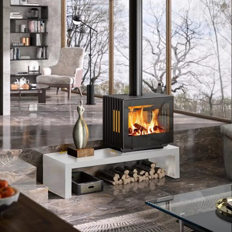 The beautifully finished Glance wide has a ribbed cast iron external body; this destinctive features is also practical as it increases the surface area to enable good heat heat distribution. The Glance wide stove is an undisputed, contemporary focal point in any room. This combined with ceramic glass on the sides, as well as at the front of this stove, it is possible to see flames dancing through the cast iron, side panels.